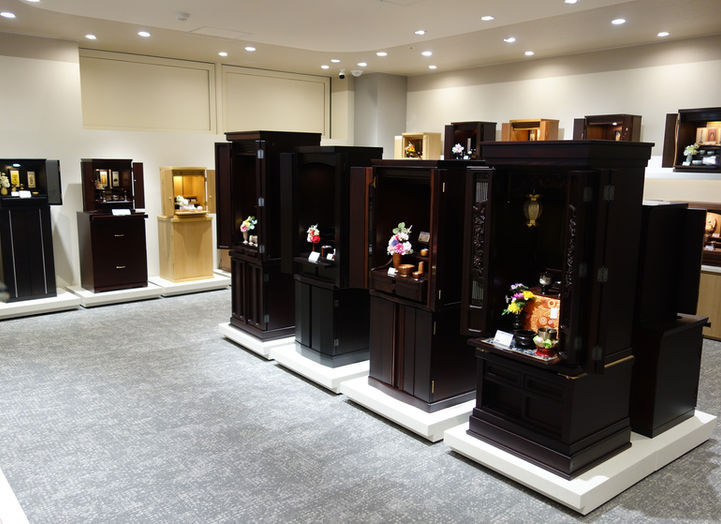 明るくモダンな店内でスタッフが丁寧にお仏壇選びのお手伝いをさせていただいています。